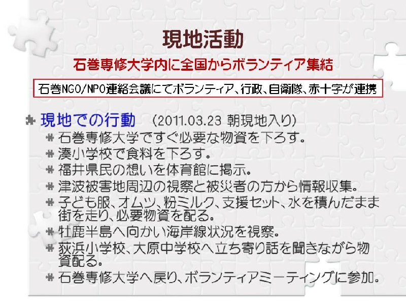 現地ボランティア団体から要望のあった支援活動(サンライズ元気村)および、被災地の方とのイベン ト交流を行いました。(OPEN JAPAN(旧ボランティア支援ベース絆)との連携による活動)