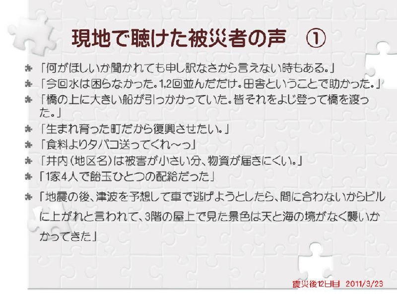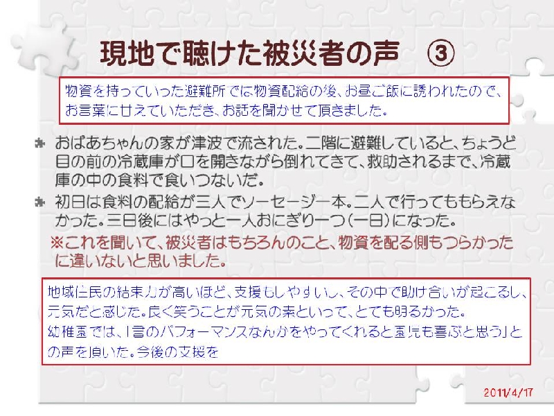 今回の参加者に石巻出身でご実家が被災された方が共にご参加されました。