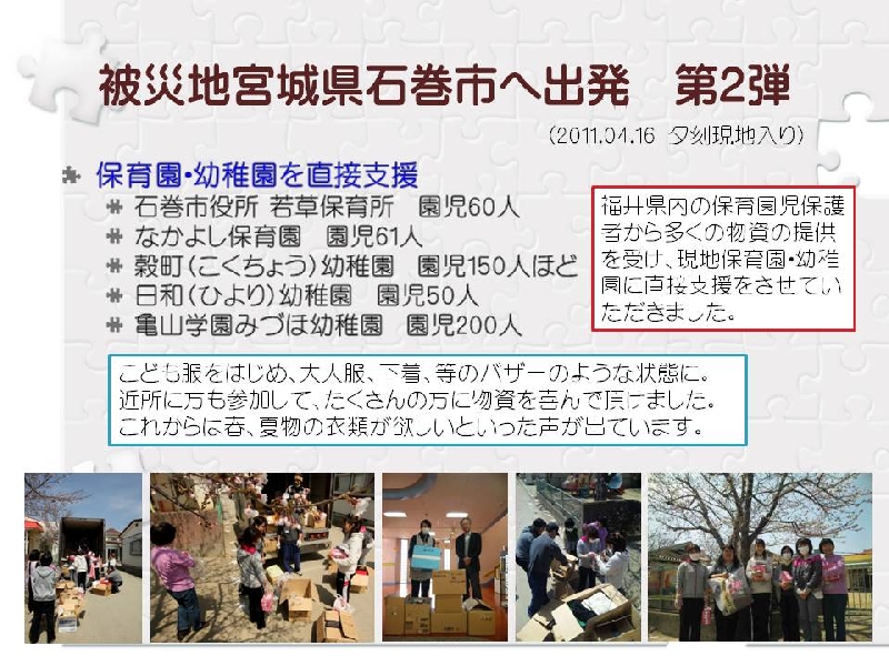 福井の保育園にて集まった物資を石巻市の下記の幼稚園・保育園に届けました。