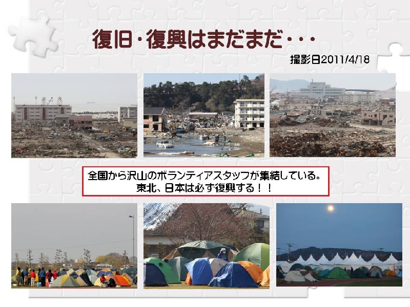 前回の作業は、被災直後だったこともあり、水道や電気などのライフラインも無い状況の中での、瓦礫や崩れた石碑の撤去、石垣の修復など重労働が中心の苛酷なツアーでしたが、その後の全国からのボランティアや現地の方々の努力により復興が進んでいますが、今なお多くの支援を必要としています。